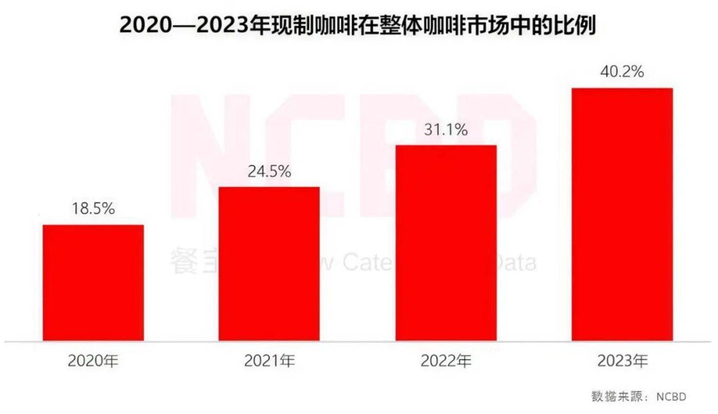 而库迪咖啡所在的现制咖啡赛道增速更猛。餐宝典发布的 《2023—2024 中国咖啡行业年度发展报告》 预测,「现制咖啡在整体咖啡市场的占比,从 2020 年的 18.5% 增长至 2023 年的 40.2%,未来这一比例将进一步增大。」