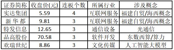 从连板情况来看,今日首板个股有 62 只;2 连板的个股有 5 只;3 连板及以上的个股有 6 只。今日连板数排名前 5 的个股包括实达集团、新华都、特发信息、品高股份、欢瑞世纪,具体如下表所示。