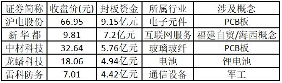 从封板资金来看,今日涨停板个股中,封板资金排名前 5 的个股包括沪电股份、新华都、中材科技、龙蟠科技、雷科防务。