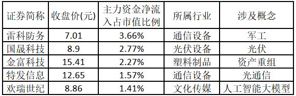 主力资金净流入金额占市值比例排名前 5 的个股分别为雷科防务、国晟科技、金富科技、特发信息、欢瑞世纪。