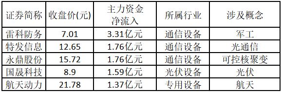 从主力资金来看,今日涨停板个股中,主力资金净流入金额排名前 5 的个股分别为雷科防务、特发信息、永鼎股份、国晟科技、航天动力。欢迎大家关注微信公众号 「道达号」,其 「道达涨停复盘」 栏目为大家解读。