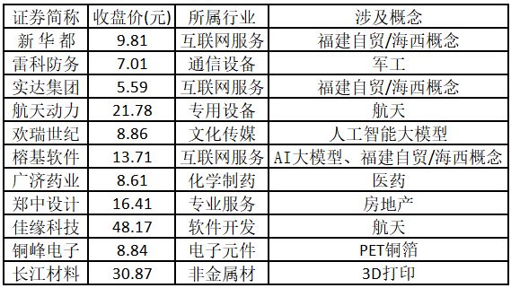 涨停板个股中,股价创出近一年新高的个股有 11 只 (不包括创出历史新高的个股),包括新华都、雷科防务、实达集团、航天动力、欢瑞世纪、榕基软件、广济药业、郑中设计、佳缘科技、铜峰电子、长江材料,具体如下表所示。