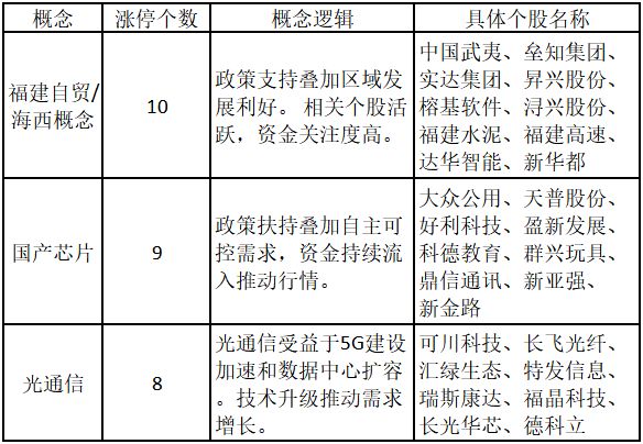从概念特征来看,今日涨停板个股中,福建自贸/海西概念、国产芯片、光通信概念个股最多。