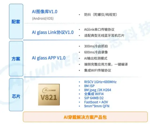 更关键的是,V821 的成本极具竞争力,官方披露仅 3~5 美元,远低于高通 AR1 Gen1 约 60 美元的售价。基于此,全志科技推出了名为“ 慧眼” 的 AI 眼镜解决方案,融合芯片层、方案层、资源层及 AI 大模型接口,帮助中小厂商快速完成产品定义与量产导入。