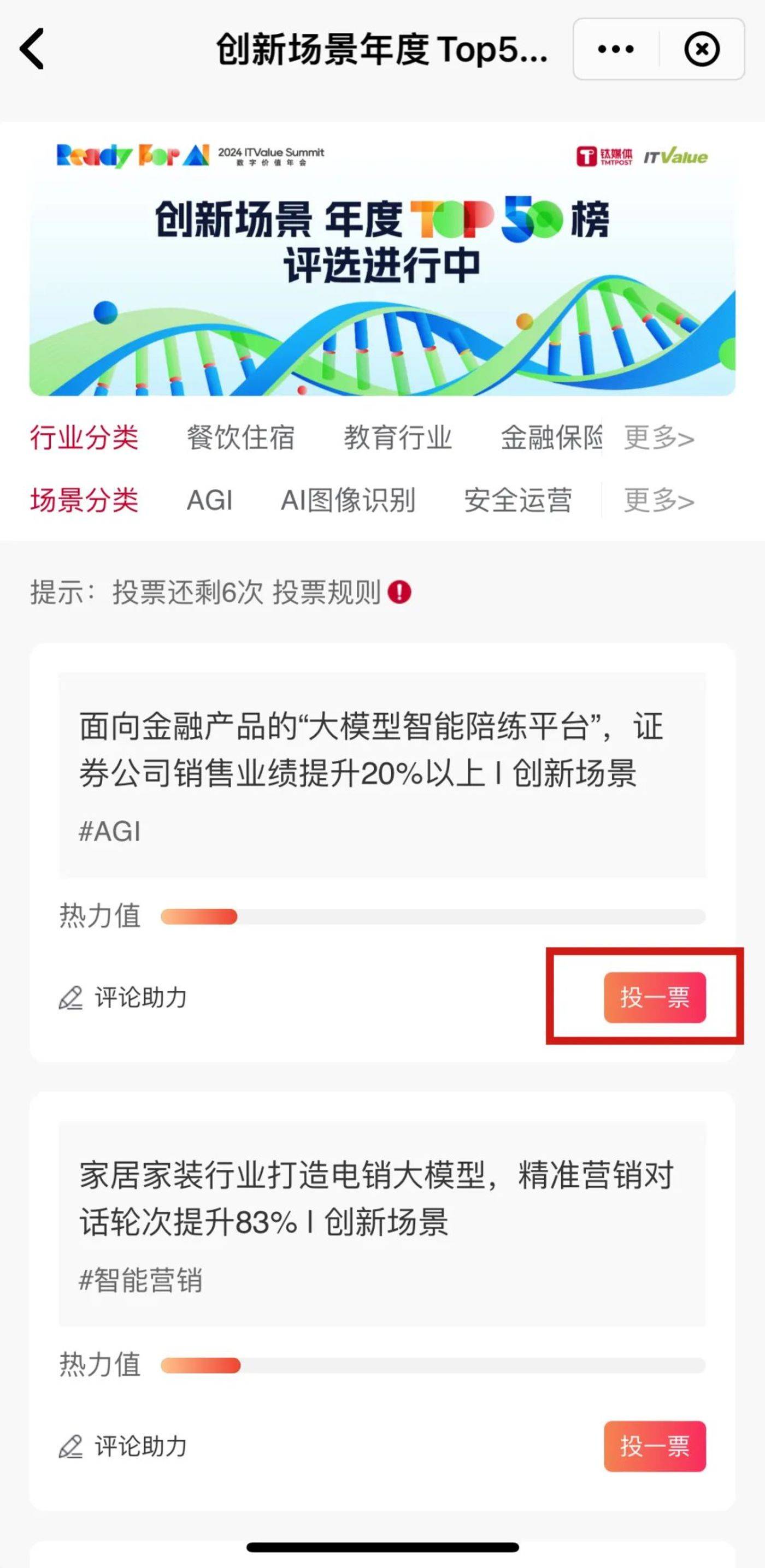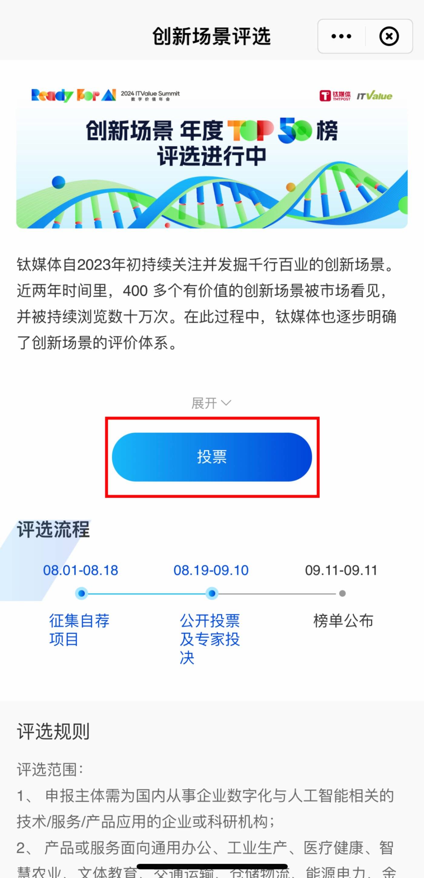 根据 2024「创新场景 TOP50」 榜单的评选规则,最终榜单结果由公开投票、专家投票及钛媒体对应领域作者及垂直领域自媒体主理人投票结果共同组成。公开投票环节结束后,专家委员会将秉持客观公正的原则,在公开网络投票结果的基础上展开综合评定。