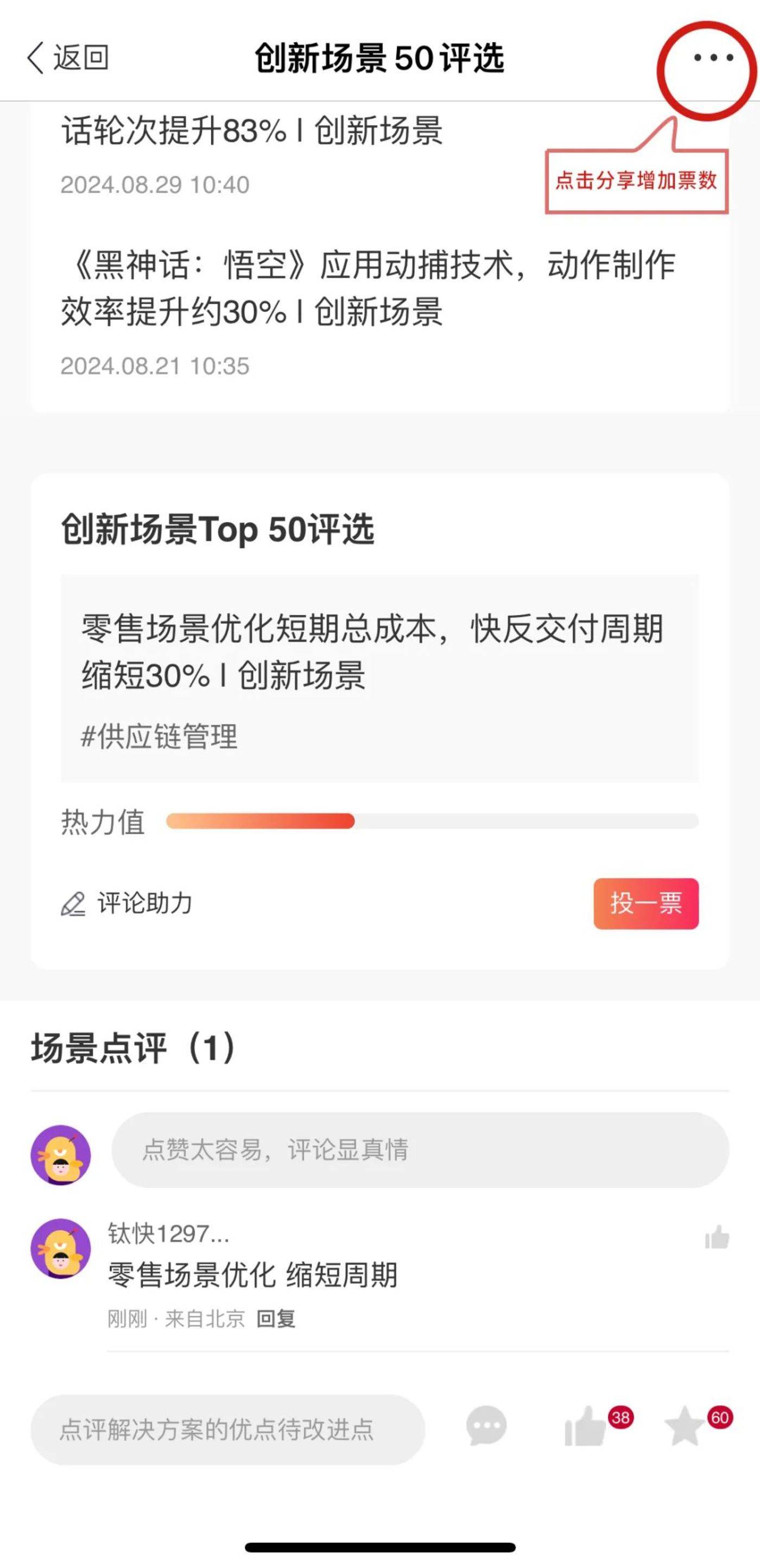 在场景文章页面,点击右上角分享按钮,分享给微信好友、群或朋友圈后自动增加票数。