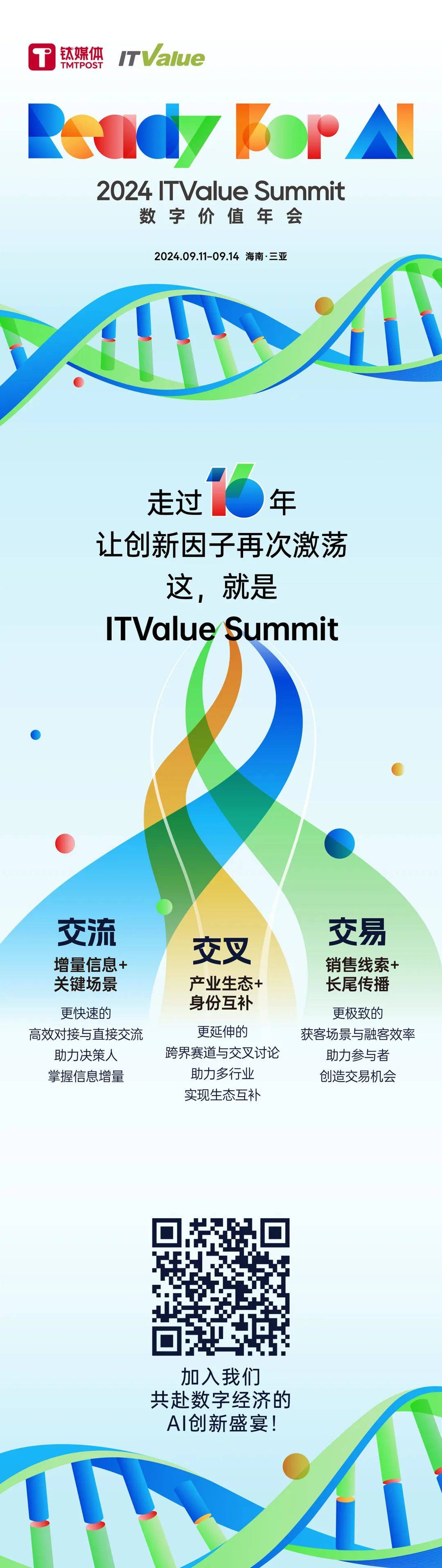 最终榜单将于 9 月 12 日 2024ITValue Summit 数字价值年会上发布,届时,年会现场将以创新场景为基础,邀请商业领袖与行业大咖,共话 AI 驱动下数字经济时代的全新机遇!
