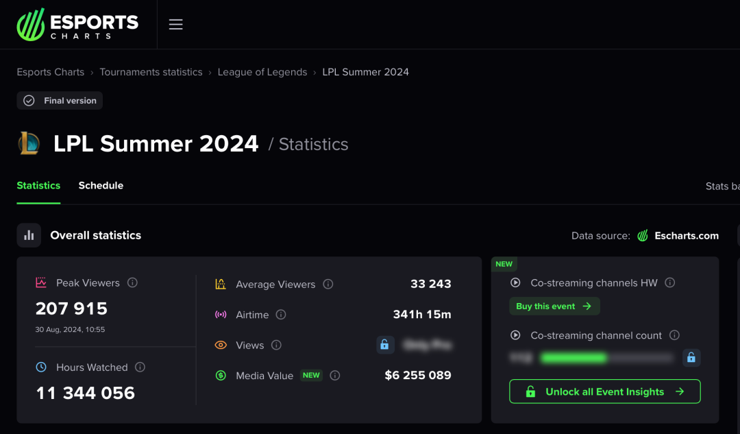 进入 2024 年后,LPL 热度稍有回暖,但很快又呈现出颓势。据 EsportChatrs 官网数据显示,2023 年 LPL 春季赛的观看人数峰值为 20 万人,夏季赛的观看人数峰值增长到 28.8 万人。在此基础上,2024 年 LPL 春季赛的观看人数峰值达到了 29 万人,但这一数据在随后的夏季赛跌到 20.8 万人,几乎回到了 2023 年的低谷。