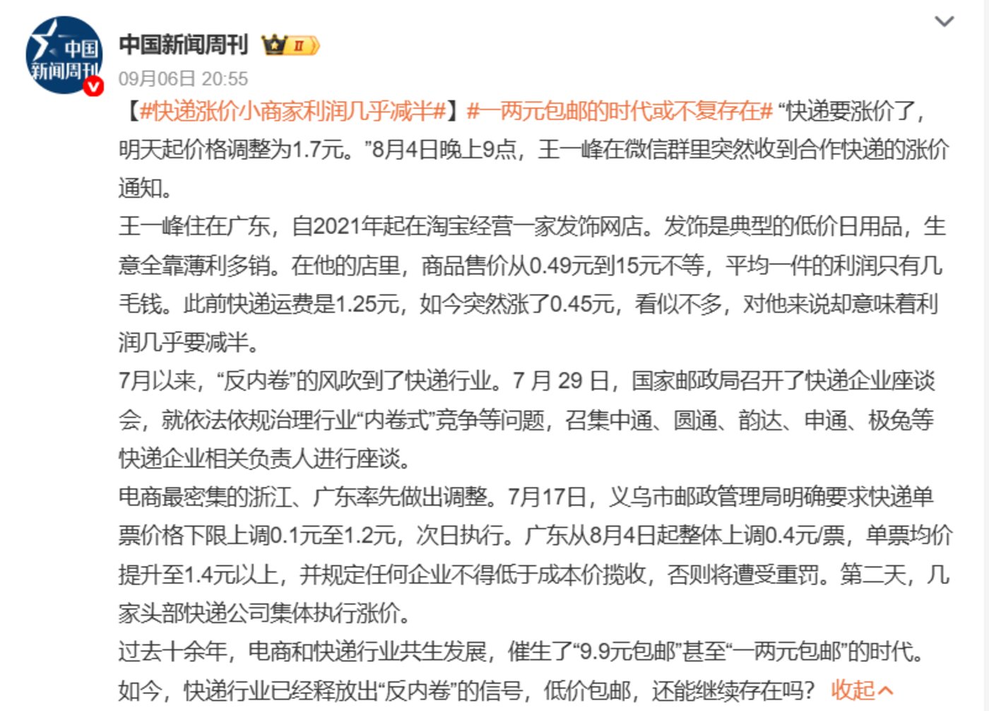 今年 6 月,国务院发布 《互联网平台企业涉税信息报送规定》,所有电商平台的经营者都将被纳入 「数据透明」 体系,商家再难钻 「不开发票」「少报收入」 的空子。7 月份,在国家邮政局的引导下,各地快递费用也开始进行 「反内卷」 的涨价。
