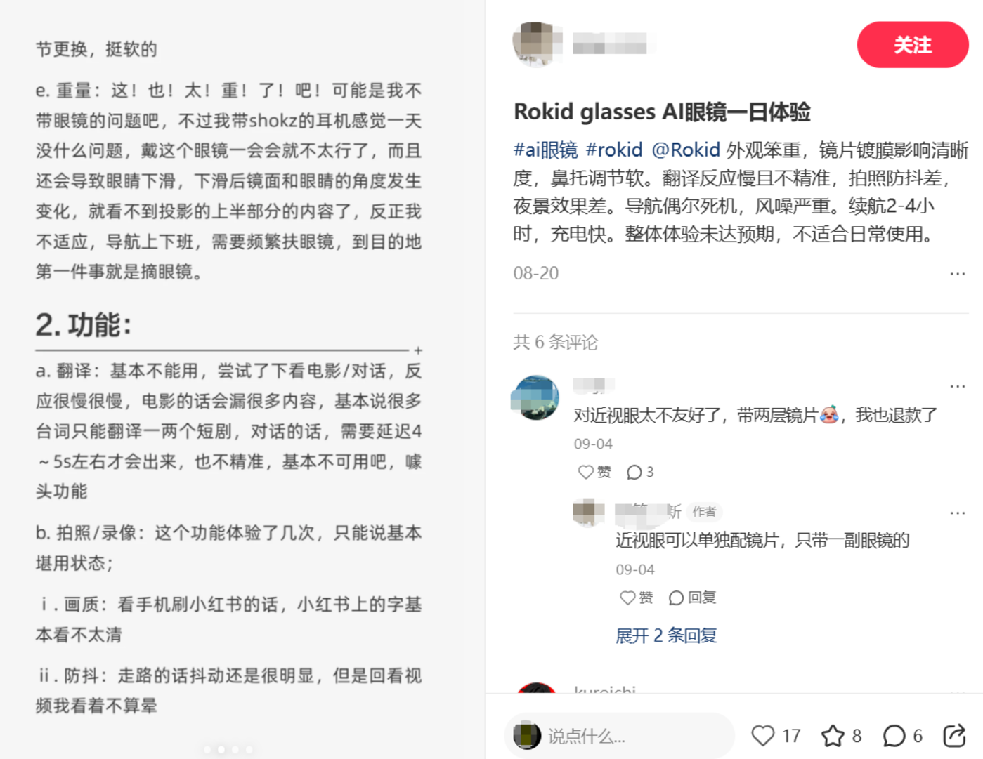 AI 功能的 「伪智能」 更是引发信任危机。有用户在社交媒体分享使用经历:小米 AI 眼镜经常出现没有响应的现象,有些识别还会乱说话;Rokid 眼镜 「翻译基本不能用,反应很慢,电影的话会漏很多内容,也不精准。」 这些问题并非个例。