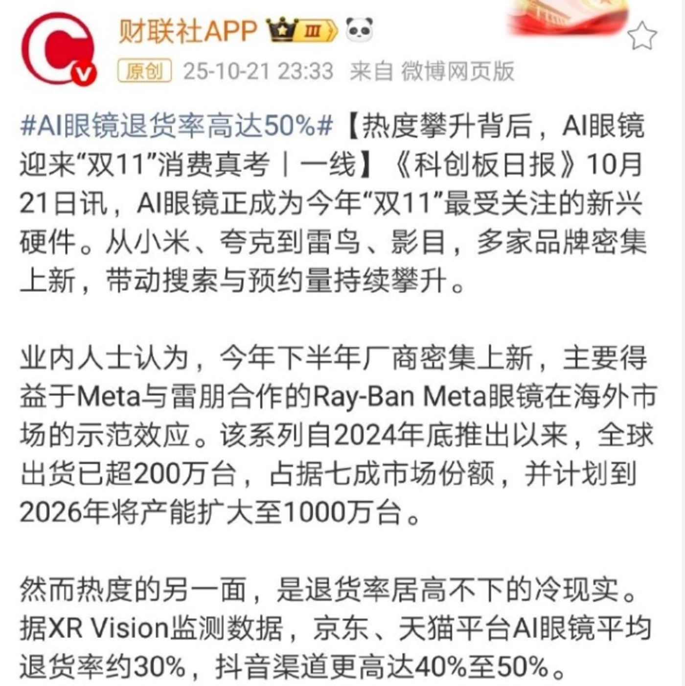 XR Vision 的监测数据印证了这一说法,京东、天猫平台 AI 眼镜平均退货率约 30%,抖音等依赖直播带货的渠道因 「冲动消费」 比例高,退货率比传统电商平台高出 10-15 个百分点。