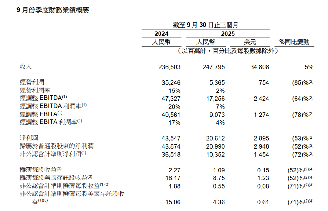11 月 25 日,阿里巴巴发布了 2025 年第三季度 (2026 财年第二财季) 业绩,有赖于云业务、核心电商业务的贡献,总营收为 2477.95 亿元,同比增长 5%;如果不考虑剥离高鑫零售和银泰对收入的影响,则同比增长 15%。