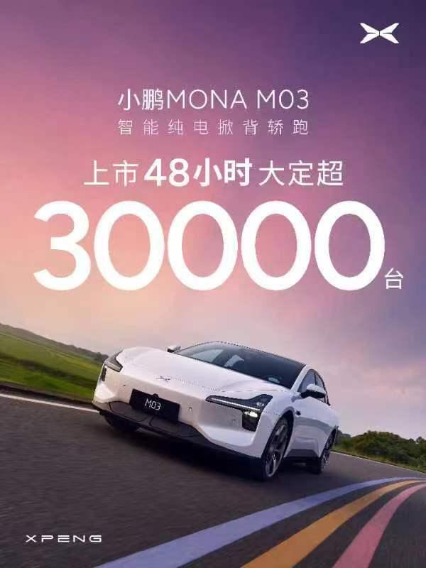 2024 成都车展期间,据小鹏 MONA 产品系列负责人杨光在发布会上透露,MONA M03 上市 48 小时大定超 3 万。