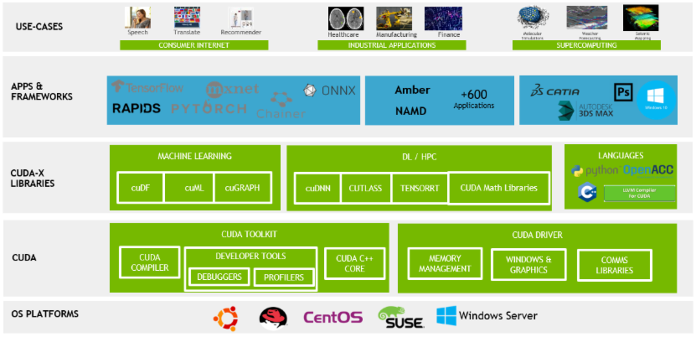 第二,广泛适配,已形成成熟生态。从科研机构用的小模型,到OpenAI 训练的 GPT-5 等超大模型;从医疗影像分析、自动驾驶,到短视频推荐、语音助手,几乎所有 AI 相关的场景,都有现成的 CUDA 优化工具和案例。