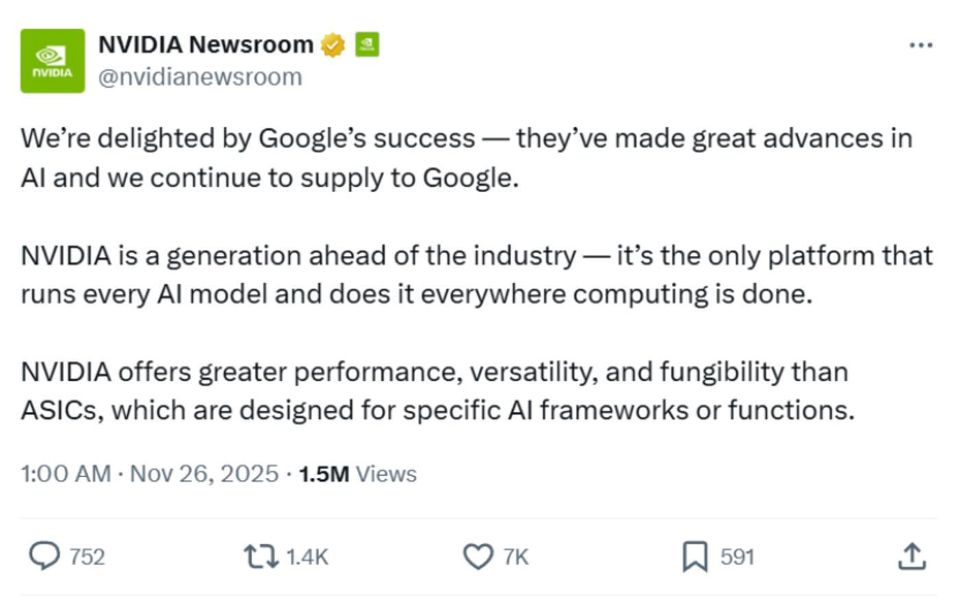 11 月 26 日凌晨1 点,英伟达罕见发布紧急声明,回应近期市场对AI 硬件发展路线的热议。业界普遍认为,此举与谷歌第七代Ironwood TPU 正式上市,以及 Meta 考虑采用 TPU 方案等行业动态密切相关。
