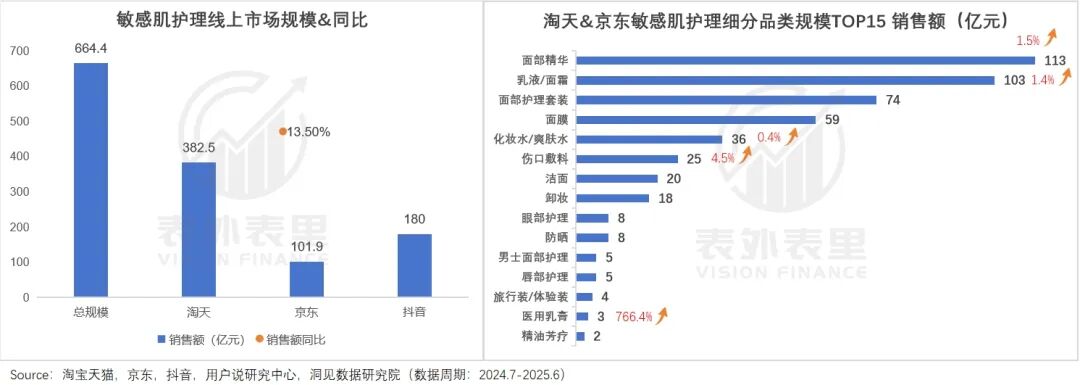 “ 药不能停” 式的庞大需求,让一个千亿市场拔地而起。如下图,截至 2025 年 6 月,中国线上敏感肌护理市场规模整体达到 664.4 亿元。
