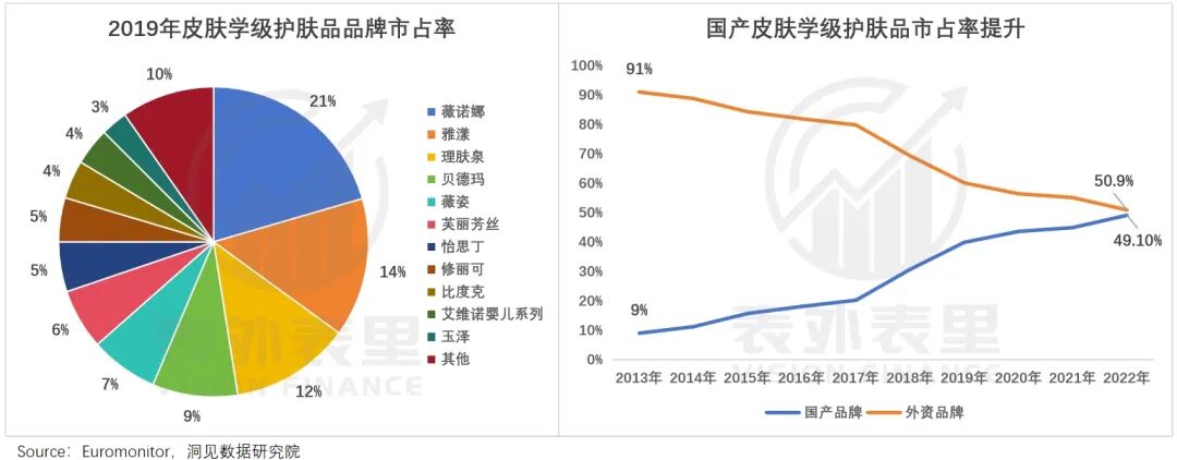 这样一来,消费者会如何选择不言而喻。如下图,2019 年国产品牌薇诺娜、玉泽的市占率,荣登第一、第二;2022 年国产皮肤学级品牌的市占率增长至 49.1%,几乎和外资品牌持平。