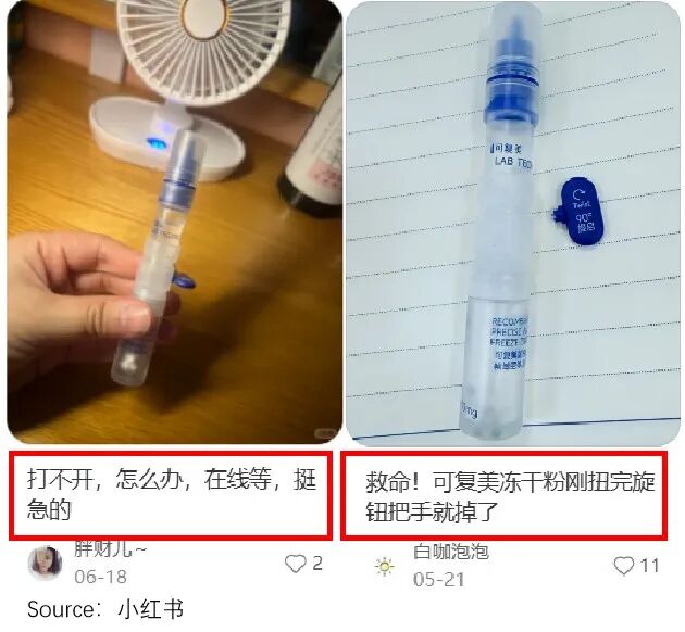 “ 问题就出在,开启方式设计得跟渡劫似的。”Lemon 解释道,开关稍一用力,就容易扭断,且需要很大力才能推动包材,让液体和冻干球融合。报废的这支就是完全推不动,自然无法融合。