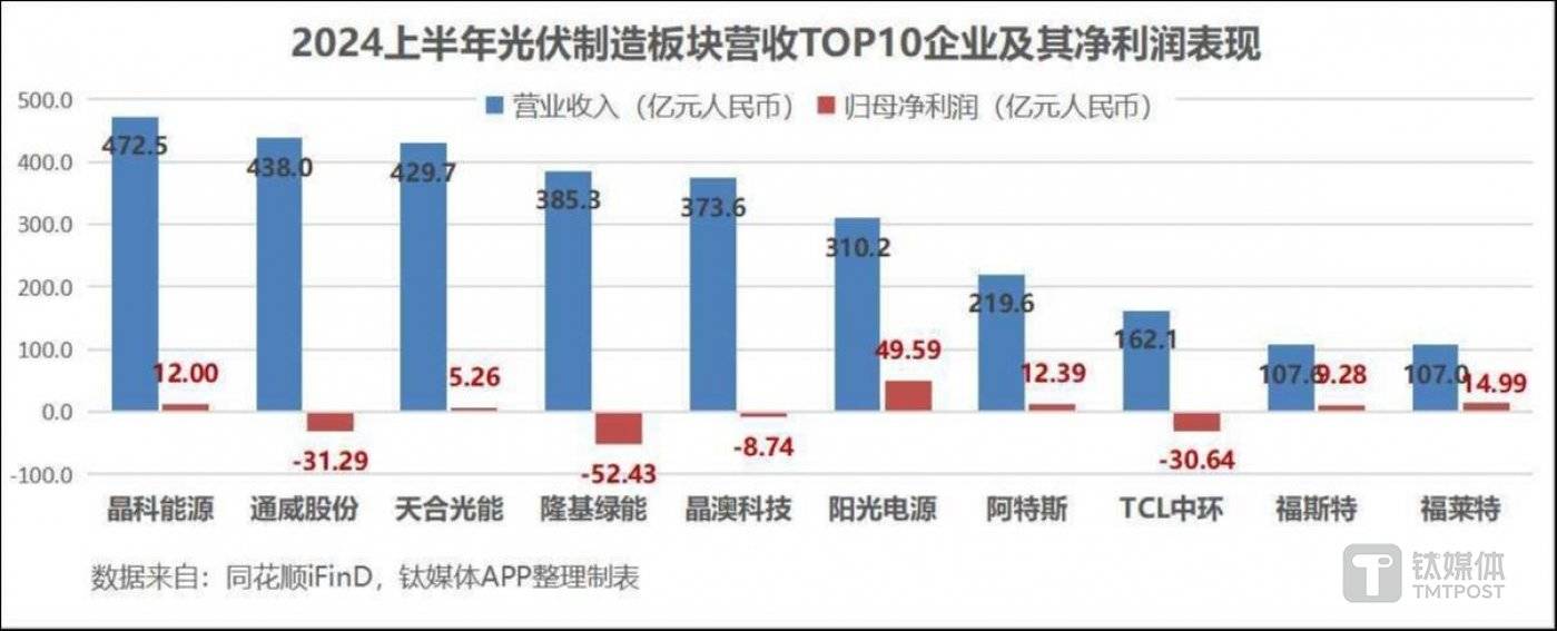 而根据最新公布的半年报,通威股份营收 437.97 亿元,同比下降 40.87%,与一季度一样在光伏制造板块排名第二;隆基绿能上半年营收 385.29 亿元,同比下降 40.41%,在光伏板块中排名第四。