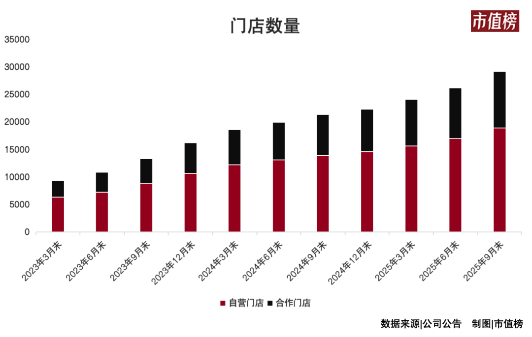 2023 年起,在和库迪打擂台赛的过程中,瑞幸通过“ 带店加盟” 模式加速扩张,6 月,门店突破万家,2024 年 7 月,门店数量突破 2 万家,到 2025 年 9 月末,门店数量来到了 29214 家。这两年,平均每 1.1 个小时,瑞幸就增加一家门店。