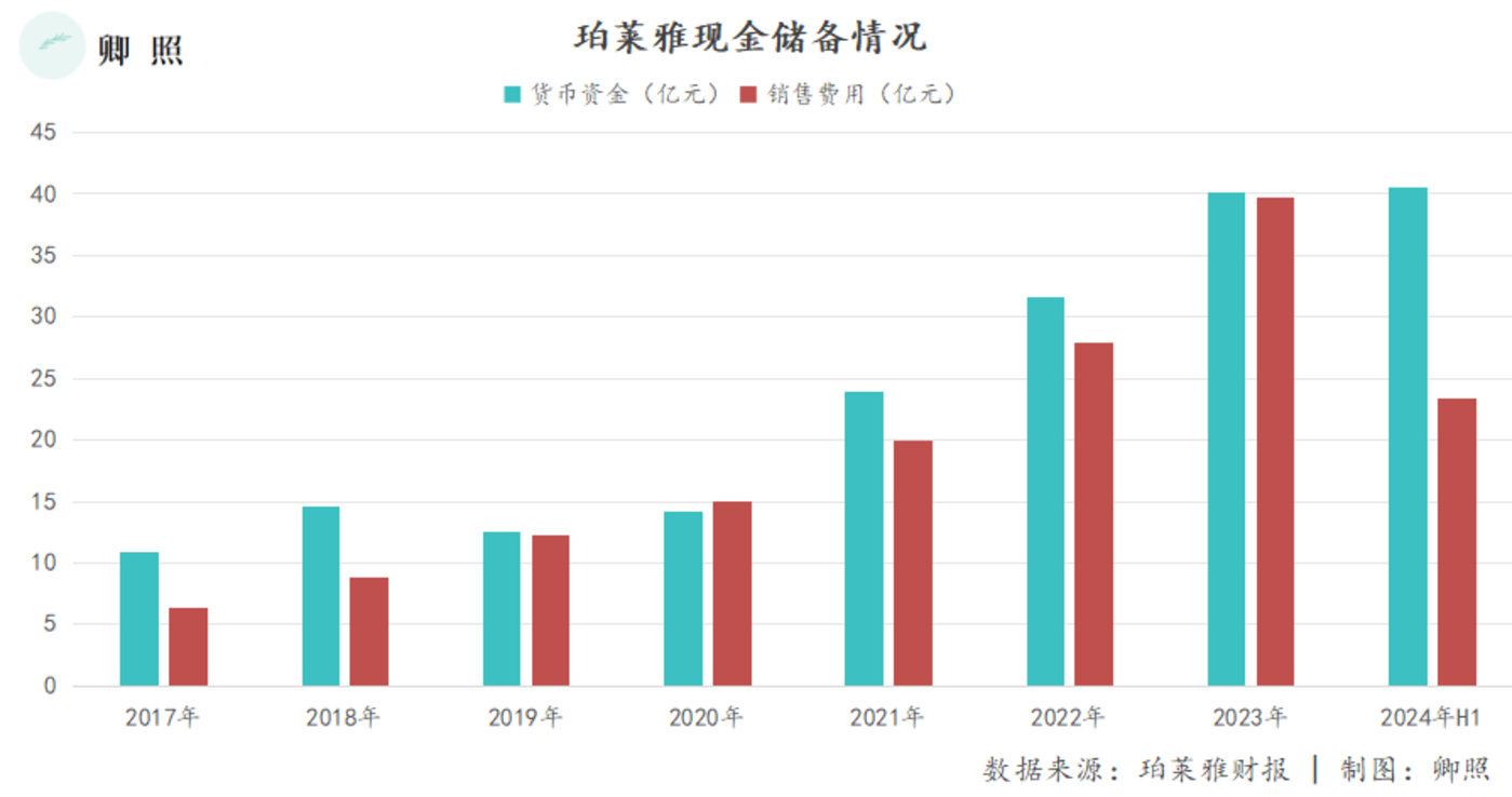 不过,值得注意的是,随着营销活动的加重,珀莱雅现金储备几乎已经与营销费用持平:2023 年年末珀莱雅现金储备 40.11 亿元,与销售费用 39.72 亿元几乎持平,如果再加上研发费用 (1.74 亿元) 和管理费用 (4.55 亿元) 的开支项,那部分时间可能就要考验企业货款账期安排了。而今年上半年,管理费用成为珀莱雅首个节流的开支项,从去年同期的 1.92 亿元到如今的 1.77 亿元,数值上削减了 1500 万元。这呼应了行业基本面的两则信号:一则是,上半年我国化妆品零售总额为 2168 亿元,同比增长仅 1%,到了 7 月份,成交额更是同比下滑了 6.1;另一则是,青眼数据显示,至少 1800 家近 7 个月成立的化妆品企业 「倒闭」 或 「消失」。很显然,中国美妆行业已经结束粗放式增长趋势,进入存量发展阶段,倒闭潮的到来更是解释着行业出清的信号。