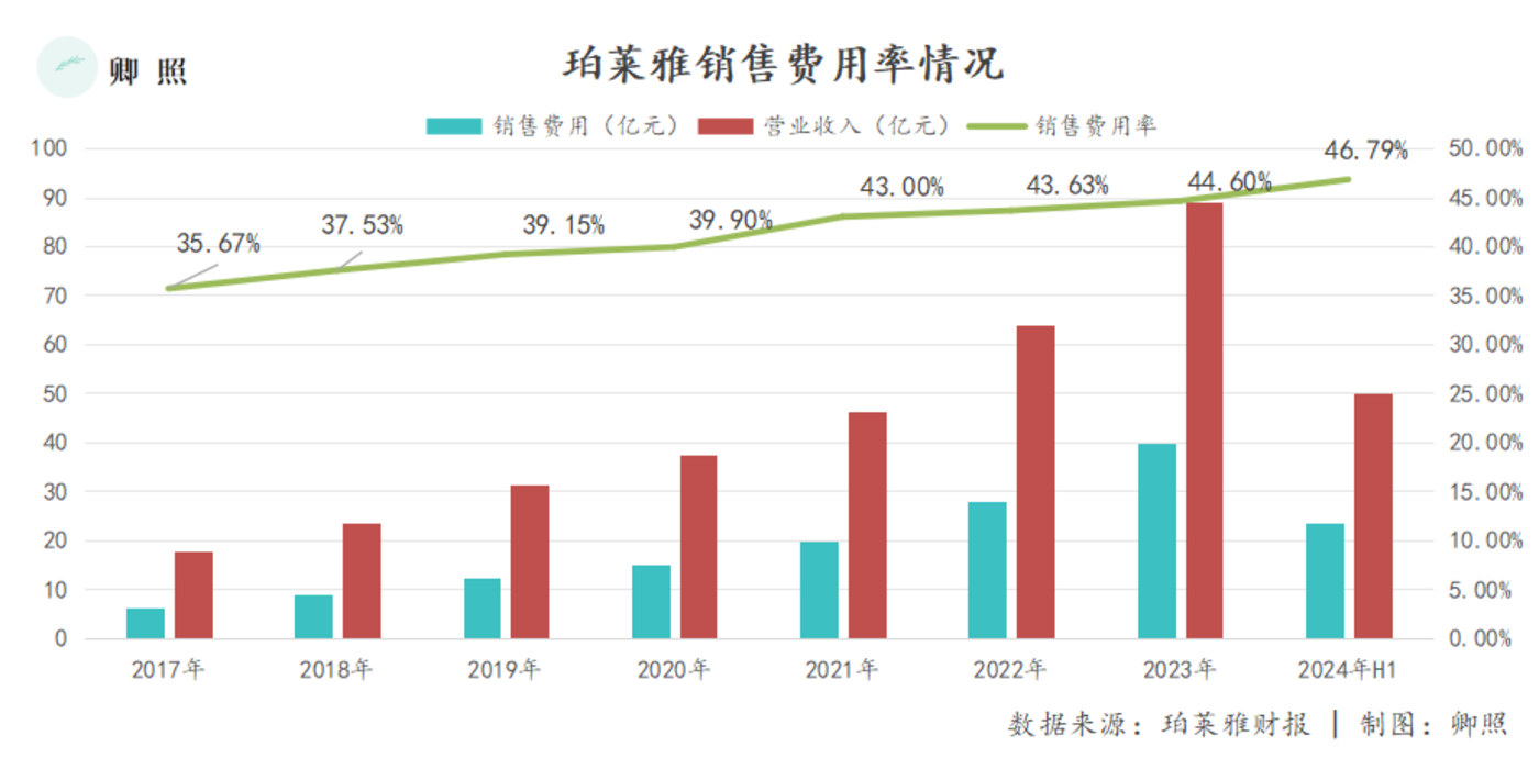 2024 年 H1 仍在延续,线上渠道收入为 46.81 亿元,为珀莱雅贡献了 93.69% 的营业收入,既有体量下,线上收入 40.52% 的增长率,可以从一定程度上说明,即便进入存量时代,珀莱雅也在流量竞争中处于优势地位,这也进一步拉动了集团总体业绩的持续增长。但线上化的另一面是,珀莱雅屡创新高的营销投入,2024 年上半年,珀莱雅销售费用为 23.40 亿元,同比增长 48.08%,超过营业收入增长率。放长来看,销售费用一直是珀莱雅一大支出项,销售费用率从 2017 年至 2024 年 H1 增长超过 10%,过去几年的收入高增长几乎都匹配了更高增长的销售投入。