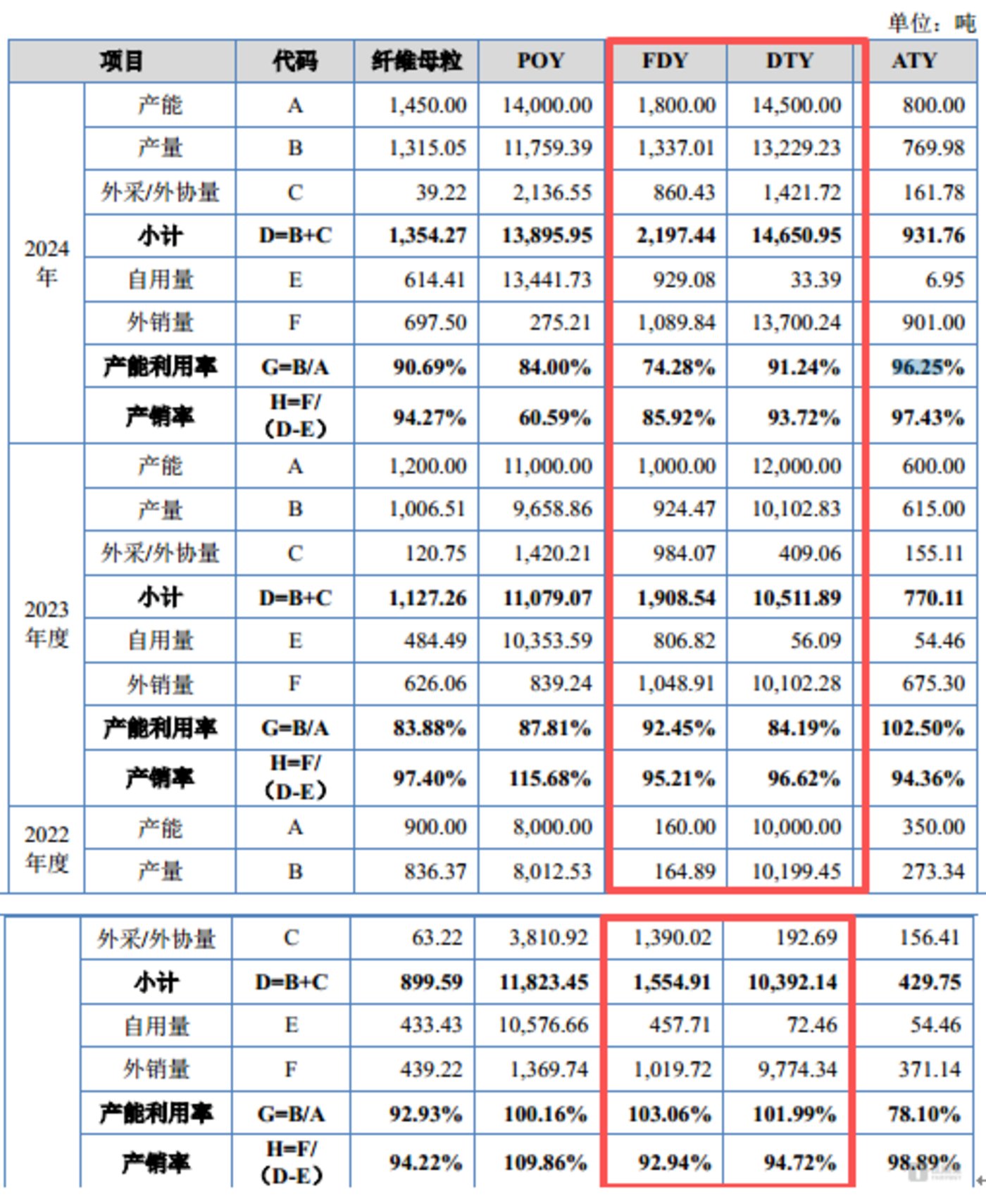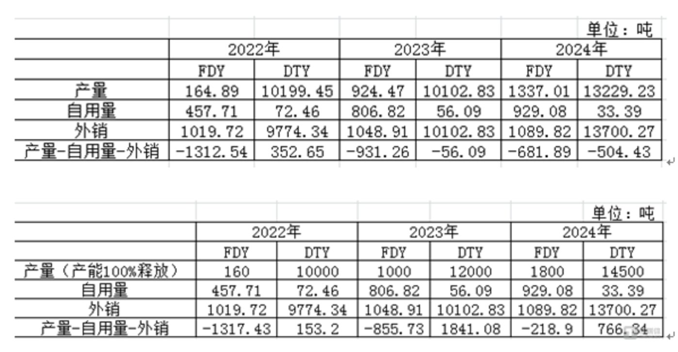 更关键的是,除 2022 年 DTY 总产量能覆盖自用量与外销量外,其余时间段 FDY、DTY 的自用量与外销量之和均超过总产量,超出部分需通过外购半成品或外协加工补充,而从产能潜力来看,若完全释放现有 DTY 产能,其产量已足够覆盖市场需求。
