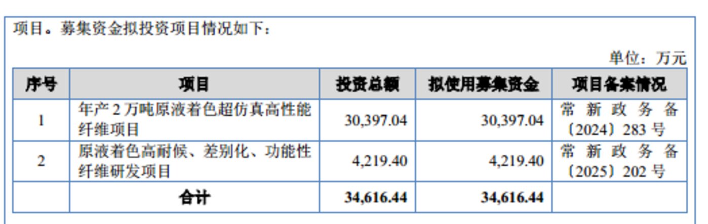 差别化涤纶长丝又主要由 POY、DTY、FDY 和 ATY 等构成,而欣战江此次 IPO 募资的目的便是扩充这些产品的产能。据悉,欣战江此次 IPO 欲募集 34616.44 万元,其中 30397.04 万元用于年产 2 万吨原液着色超仿真高性能纤维项目,占募资总额的 87.81%,项目建成后将新增 FDY 产能 5000 吨、DTY 产能 1.5 万吨。