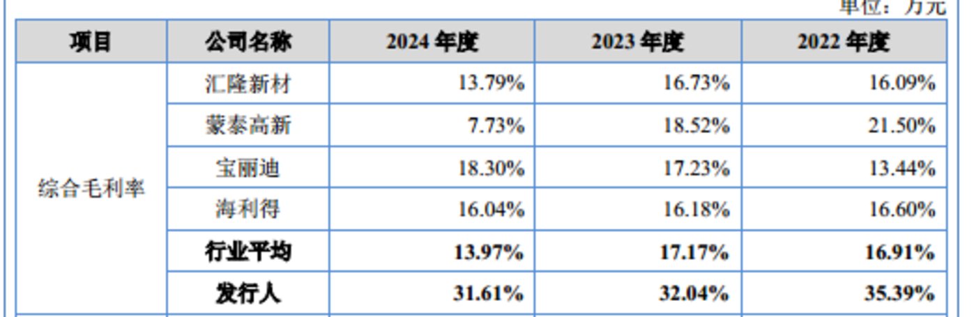 值得关注的是,即便毛利率持续下滑,欣战江仍保持着远超同行的毛利率优势。公司在申报稿中选取汇隆新材、蒙泰高新、宝丽迪、海利得作为可比公司,这三家公司报告期内毛利率平均值分别为 16.91%、17.17%、13.97%,而欣战江的毛利率始终超出同行均值近 15 个百分点,差距十分显著。