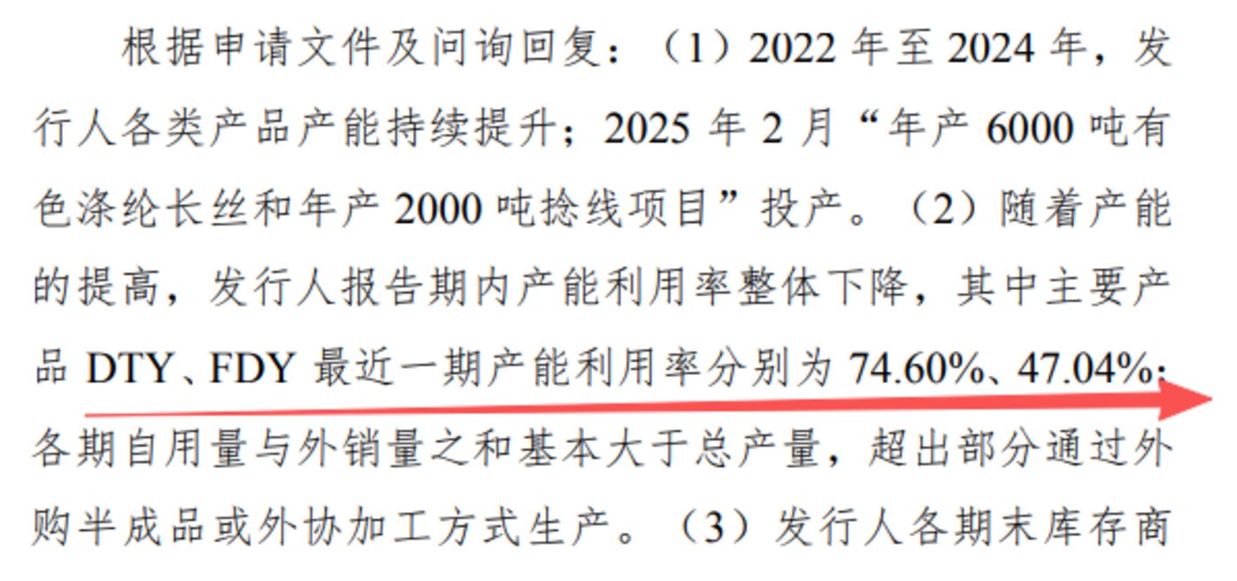 可见,报告期内,FDY 产能利用率从 2022 年的 103.06% 持续下滑至 2024 年的 74.28%,DTY 产能利用率也未完全饱和,2023 年、2024 年分别为 84.19%、91.24%,且最新一期数据显示,两者产能利用率进一步降至 47.04%、74.6%,产能闲置问题愈发明显。