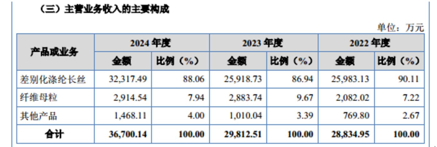 从业务上看,欣战江主要拥有差别化涤纶长丝、纤维母粒、其他产品,其中差别化涤纶长丝产生的销售收入分别为 25983.13 万元、25918.73 万元、32317.49 万元,分别占当期主营业务收入的 90.11%、86.94%、88.06%,呈现出明显的产品结构单一化特征,具体情况如下: