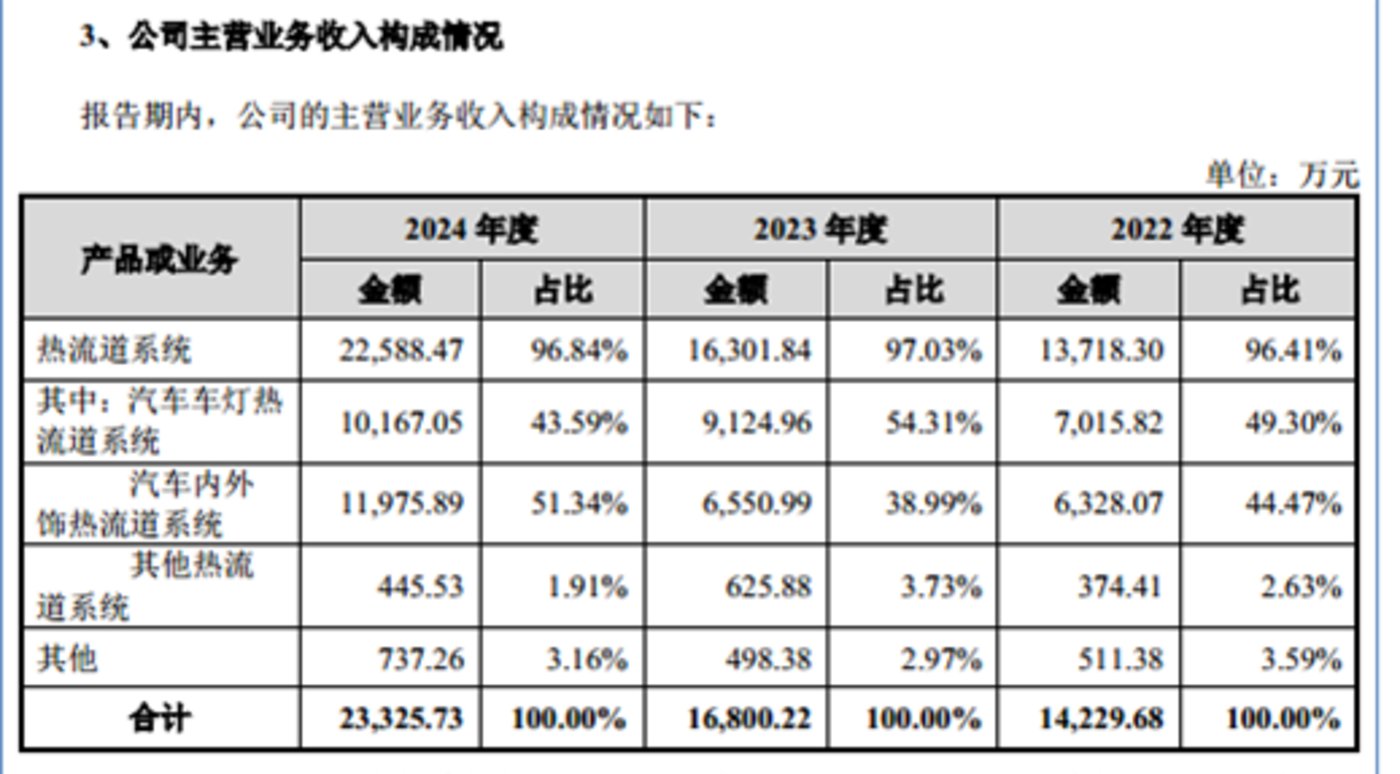 从业务结构来看,恒道科技的收入几乎全部由热流道系统构成,形成极为单一的业务架构。报告期内,恒道科技热流道系统产生的销售收入分别为 13718.3 万元、16301.84 万元、22588.47 万元,占当期主营业务收入的比例分别为 96.41%、97.03%、96.84%。