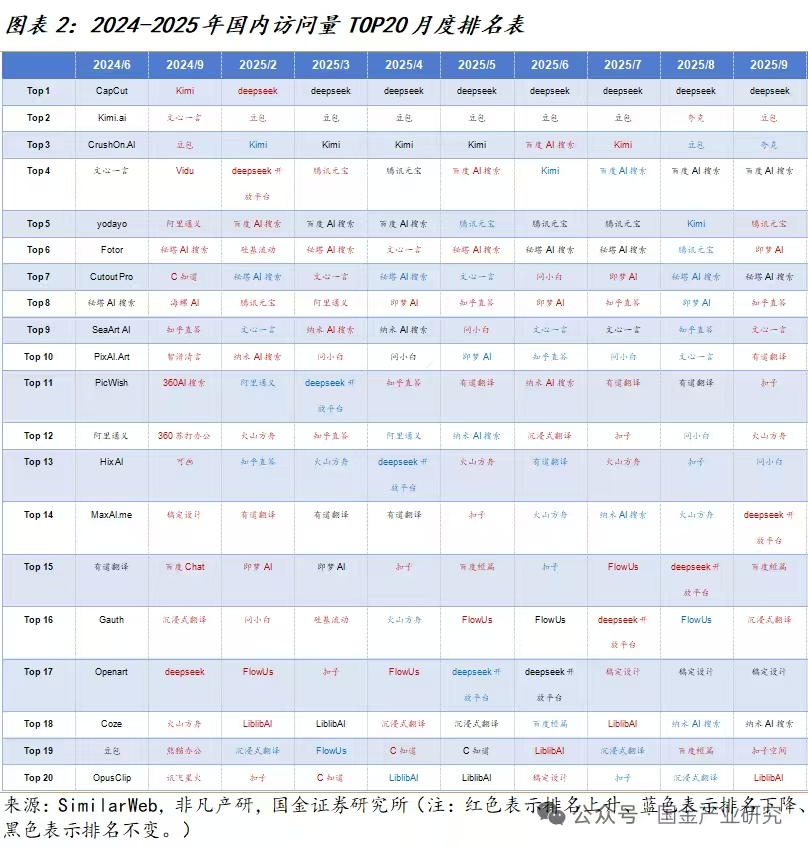 按国金此前的分析,国内市场现已形成“ 头部双强” 格局,Deepseek 自今年 2 月起长期稳居第一,豆包稳定位列前二,展现出强劲的用户粘性与市场影响力;Kimi、百度 AI 搜索及腾讯元宝等腰部应用紧随其后;而即梦 AI、知乎直答、阿里通义等则波动明显,体现出中腰部竞争激烈、替代性强。