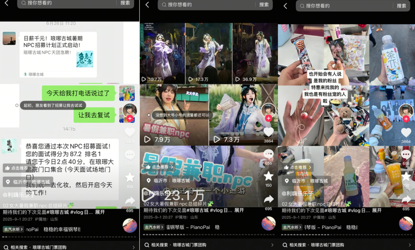 就连 NPC 招聘活动本身,包括邀请网红跨界客串,都能成为独立传播的热点。此前洛阳重渡沟景区、临沂天上王城景区、上饶婺女洲度假区都曾因高薪招聘引发热议。还有部分博主特意兼职 NPC,拉动线下流量,提升人气,比如抖音博主 「利嗨乐乐子」 就特地发布了自己在临沂琅琊古城景区做 NPC 的全过程,也有粉丝特地根据视频去到活动地点打卡留念。