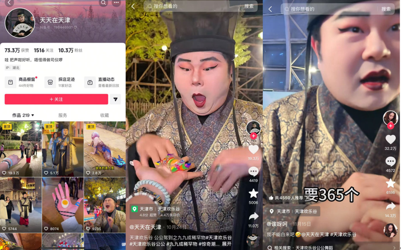 比如在天津欢乐谷饰演太监角色的 「天天在天津」,本人抖音账号仅有 10 万粉丝,但多位游客为其拍摄、上传的十几个互动视频点赞量都超过 10 万。许多网友并不知道他如何称呼,就直呼 「公公」。有游客递出糖果,公公便挑眉瞪眼、左顾右盼地把糖藏进怀里,还掏出一个比心的手势。用网友的话说,这叫情绪价值拉满。