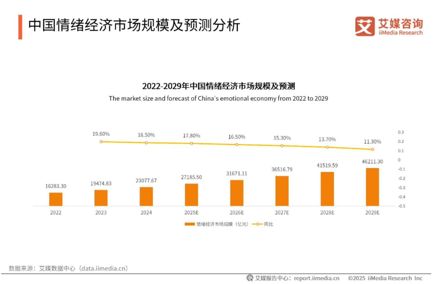 据调研机构艾媒咨询数据,国内情绪经济市场规模持续增长,2024 年为 2.31 万亿元,2025 年将增长至 2.72 万亿元,2029 年可达 4.62 万亿元,CAGR(年复合增长率) 为 14.9%;在潮玩、体验、宠物、疗愈等情绪消费领域中,包含 NPC 互动景区在内的沉浸式体验经济,为消费者偏好第一位。