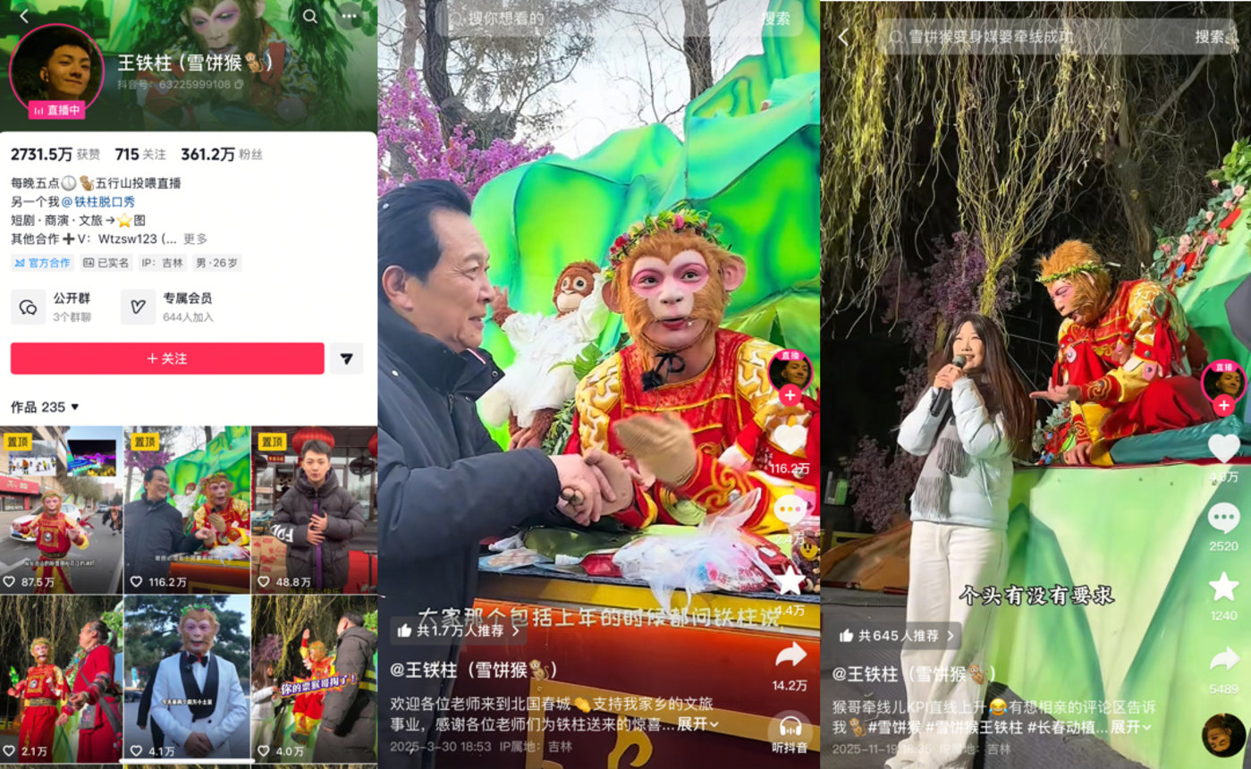 长春市动植物公园昵称 「雪饼猴」 的孙悟空 NPC 即是典型一例。目前 「雪饼猴」 扮演者王铁柱在抖音已拥有 361.2 万粉丝,在快手已拥有 35.2 万粉丝。除本人账号外,短视频平台上还有大量分享 「雪饼猴」 视频切片的账号,部分账号的累计点赞量超过了 600 万。