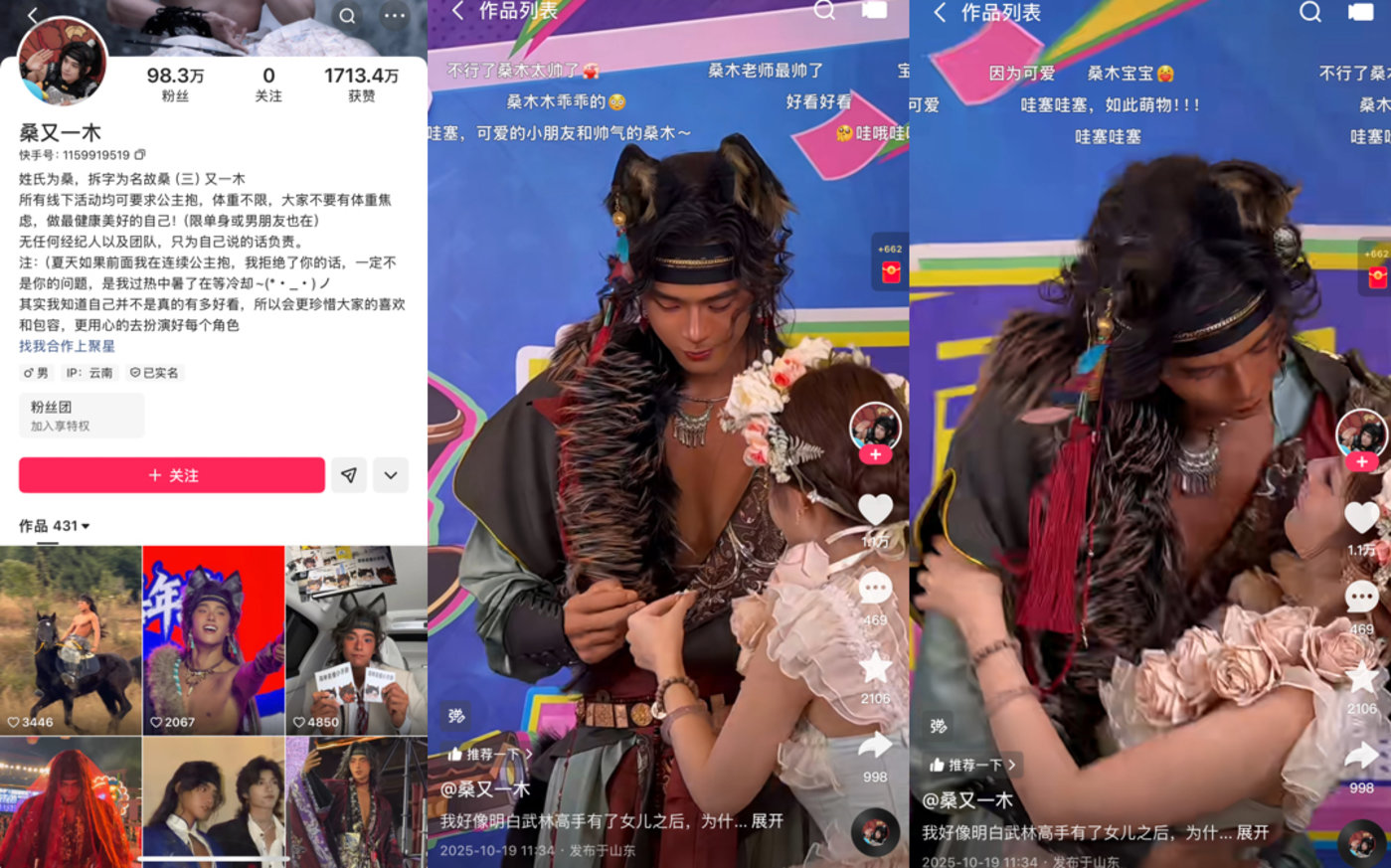 比如凭借黑皮兽耳造型与小奶狗长相迅速出圈的桑木,账号名为 「桑又一木」,目前在抖音已拥有 176.8 万粉丝,在快手已拥有 98.3 万粉丝。桑木账号还特别标注,线下互动均可进行 「公主抱」,体重不限。桑木通过可触碰的真人体验满足用户需求,火了以后,活动也从原先郑州方特欢乐世界的定点演出,拓展至全国多个城市的线下活动。