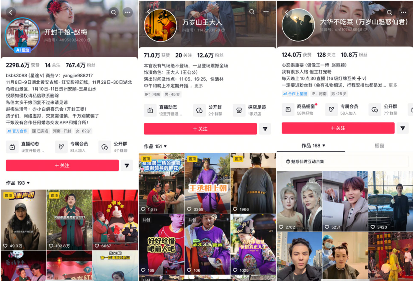 在此背景下,不少万岁山的 NPC 走红出圈。比如 「王婆说媒」,节目被网友戏称为 「接地气版 《非诚勿扰》」,「王婆」 的扮演者赵梅也由此深得网友喜爱。目前赵梅的账号在抖音已拥有 767.4 万粉丝,在快手已拥有 172.8 万粉丝。万岁山还有扮演过丞相及公公形象的 「万岁山王大人」、扮演仙君的 「大华不吃菜」 等,他们的短视频平台账号粉丝量多在 10 万以上。