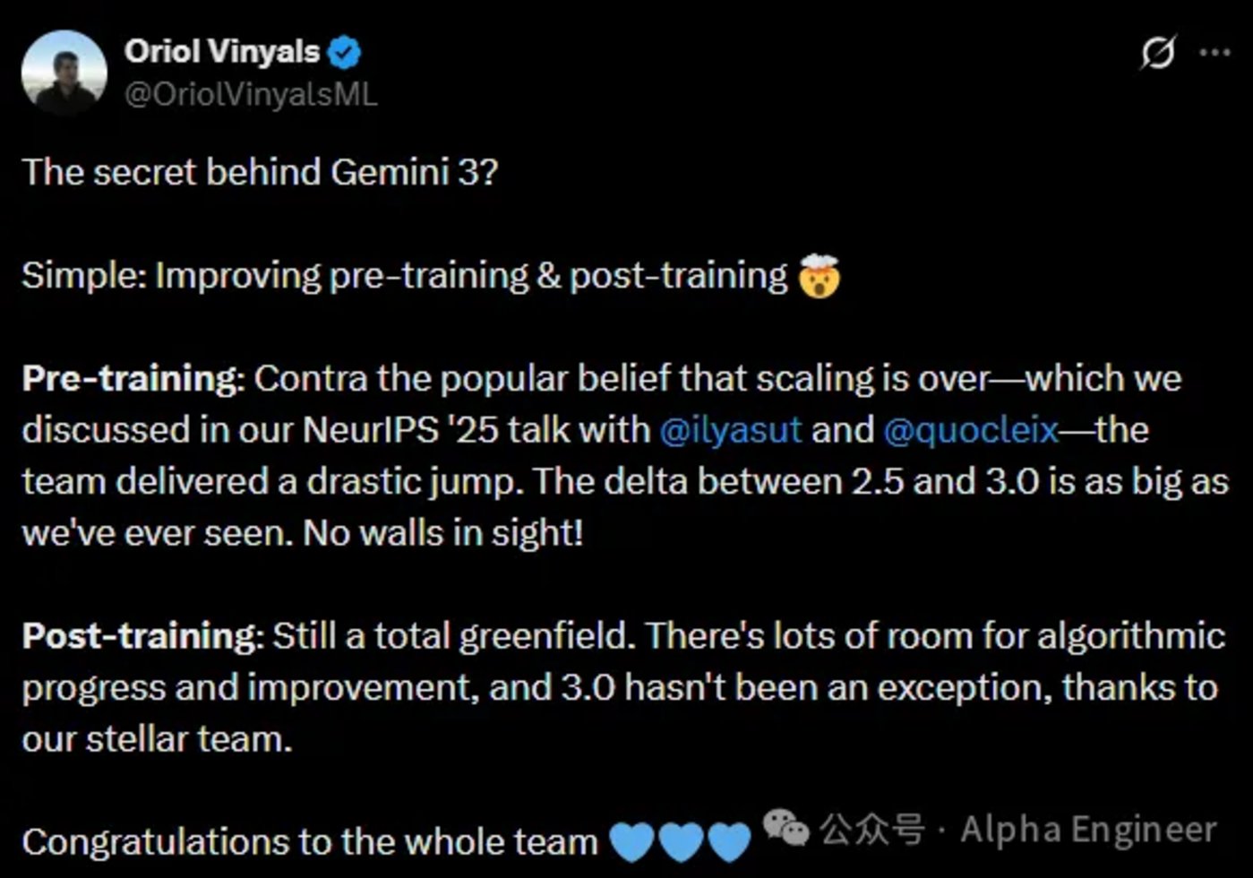 没错,Gemini 3 背后的秘密,就是预训练和后训练的 Scaling 仍然有着较大的空间。
