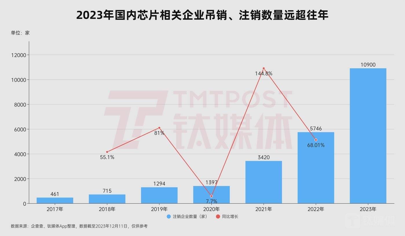 钛媒体 App 曾独家统计,2023 年,中国已有 1.09 万家芯片相关企业工商注销、吊销,同比增加 69.8%,比 2022 年的 5746 家增长 89.7%。经计算,平均每天就有超过 31 家芯片企业注销、吊销工商信息。另据钛媒体 App 编辑梳理,过去五年间,国内吊销、注销芯片相关企业数量就已经超过 2.2 万家。