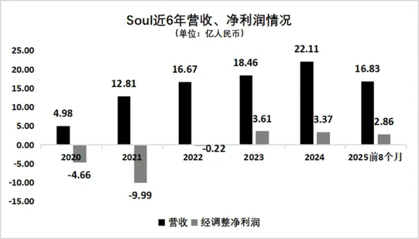 先看收入。Soul 总营收从 2020 年的 4.98 亿增长至 2024 年的 22.11 亿,2025 年前 8 个月营收更是达到 16.83 亿,较上年同期的 14.28 亿增长 17.86%。