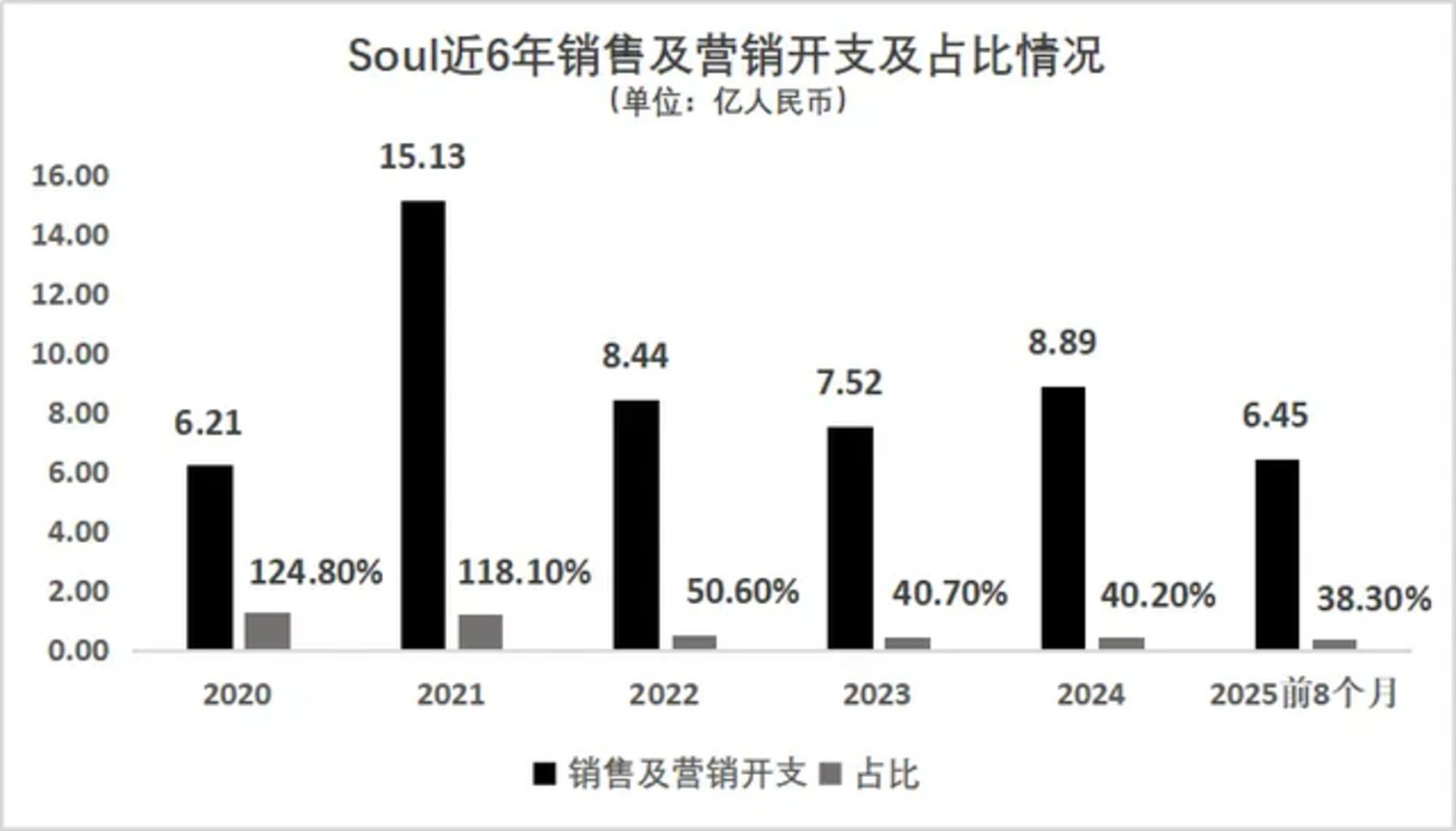 招股书显示,Soul 的毛利率长期稳定在 80% 左右,2025 年前 8 个月为 81.5%,看似是一门好生意。但高毛利率并不自动带来高利润,值得注意的是,Soul 也在收缩销售及营销开支,从 2020 年占总收入的 124.8% 回落至 2025 年前 8 个月的 38.3%,成本结构更加健康。