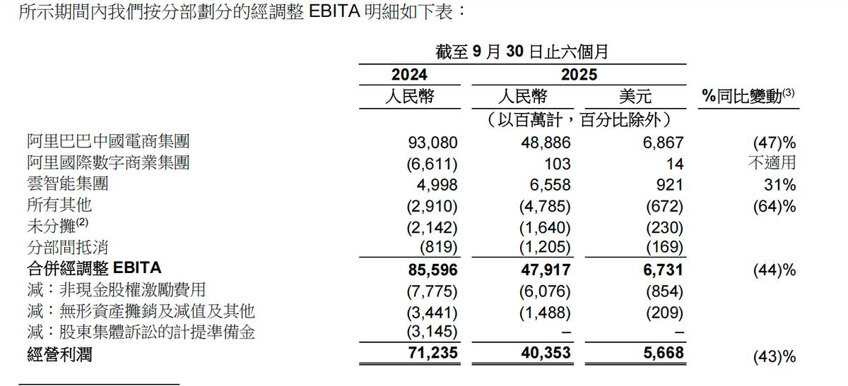 数据显示,第二财季阿里经调整 EBITA 同比下降 78%。第二财季的经营利润为 53.65 亿元人民币,比 2025 财年同期少了近 300 亿。