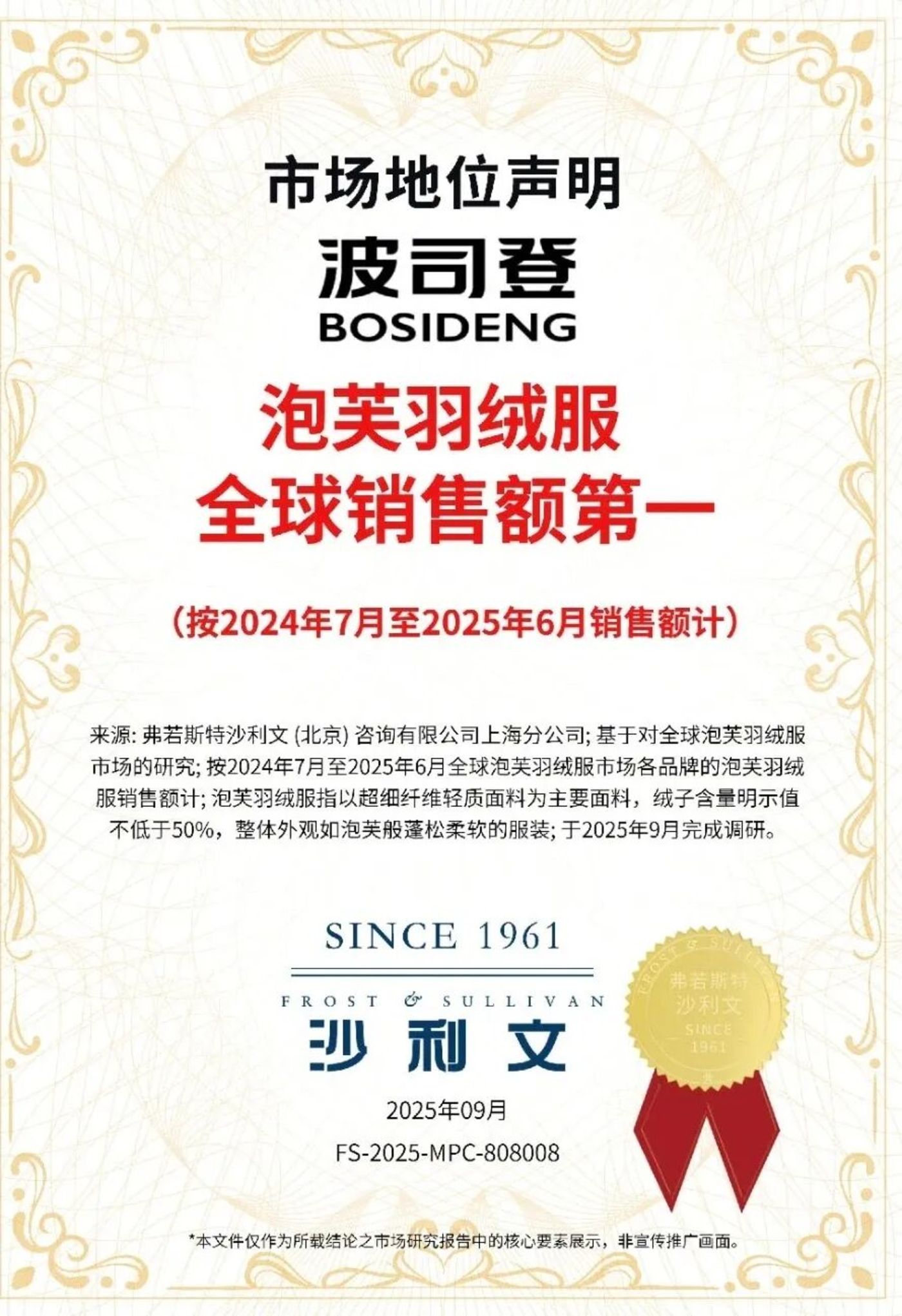 根据沙利文今年发布的报告,截至 2025 年 6 月底的过去一年,波司登作为产品的首创者,泡芙羽绒服全球销售额第一。