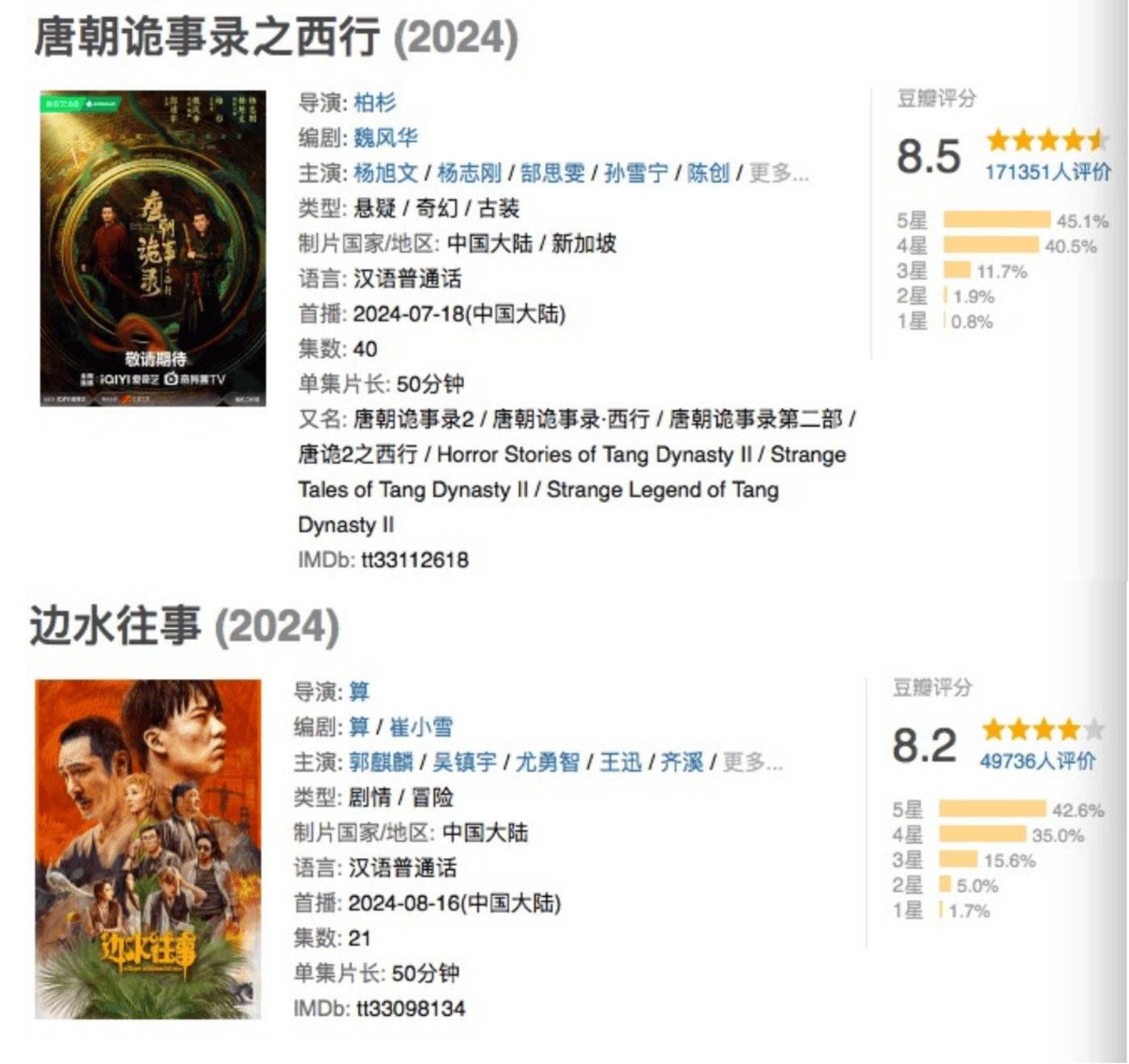 另一个大热赛道则是悬疑领域,不仅数量上占据了暑期市场的重要份额,还相继诞生了 《唐朝诡事录之西行》 和 《边水往事》 两部悬疑口碑黑马剧,截至目前二者的豆瓣评分分别为 8.5 分和 8.2 分。