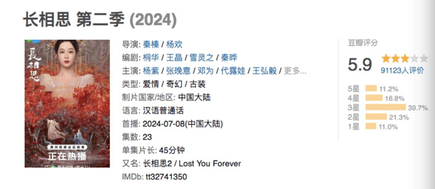 最直观的表现,一是市场热度反响一部不如一部,如景甜和张凌赫主演的 《四海重明》 热播期有效播放量仅在 1000w 左右,比去年最 「扑街」 的古偶 《七时吉祥》 还要低近 600w。二是口碑普遍欠佳,就连播得最火的 《墨雨云间》 也仅获得 6.6 的豆瓣评分,《长相思 2》 更是跌破及格线。
