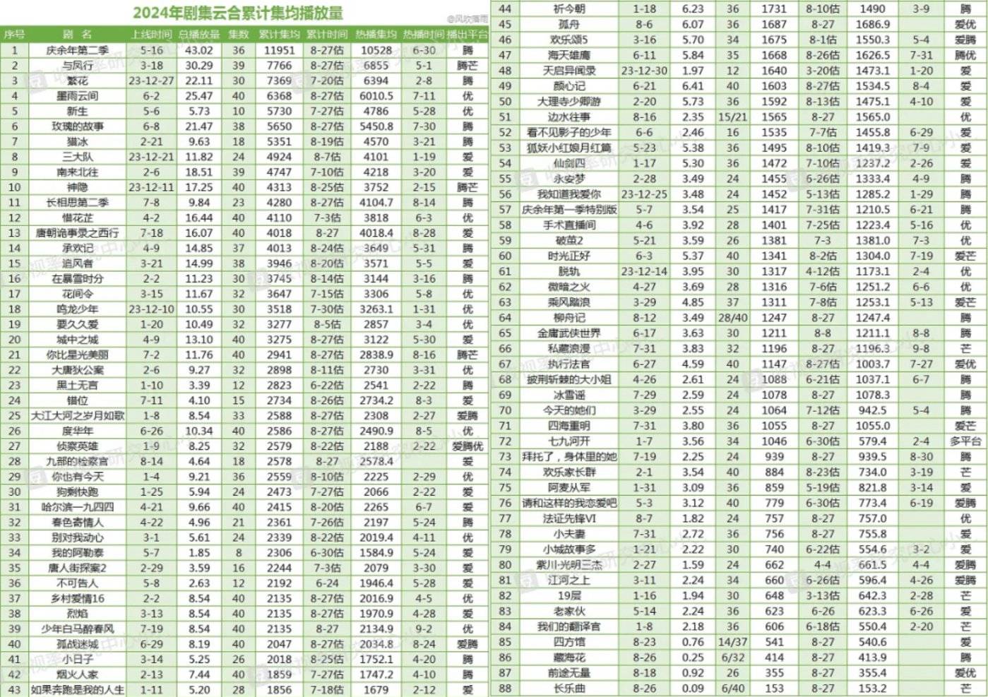另一方面,整个暑期的市场热度也呈现出高开低走的趋势。6 月初上线的 《墨雨云间》 和 《玫瑰的故事》 几乎代表着今年暑期档剧集市场的巅峰时期,此后大盘热度开始下滑,至今再未有超越者出现。有网友统计了暑期剧集的云合热播期集均有效播放量,前述两部剧的集均播放量分别在 6010w 和 5450w 左右,而后面扛起热度或口碑的代表作 《长相思 2》《唐朝诡事录之西行》 播放量都在 4000w 左右,其他剧集则是动辄不到 2000w 甚至跌破 1000w。