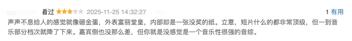 芒果应该是考虑到了综 N 代的极限,在今年推出了新的音综 IP《声鸣远扬 2025》,不过这档节目仍然没有放下对经验的依赖,套上多年前的选秀模板,鸡飞狗跳的海选、伶牙俐齿的导师、随意的赛制,却没能赢得市场的关注,播出一个多月也未能出现出圈的话题与热度。