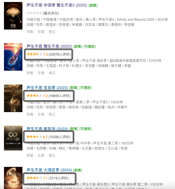 但一个不争的事实是,市场对这一 IP 的关注度正逐渐消退。豆瓣上对这一 IP 的打分人数从首季的 3.3 万人逐年下滑,到了去年的 《声生不息· 大湾区季》 仅有 7219 人参与打分,节目对市场的影响力大不如前。